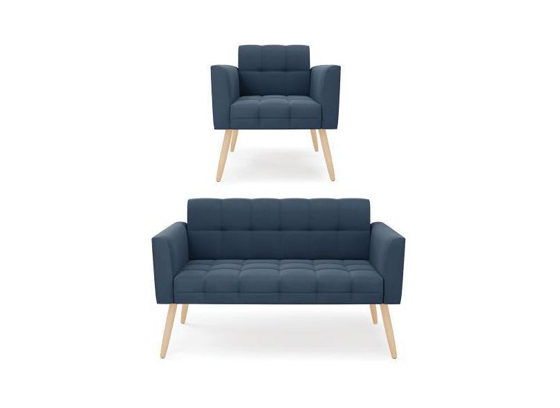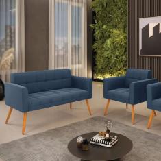 Kit 1 Sofá Namoradeira e 1 Poltrona Elisa Suede Azul Marinho Pés Palit
