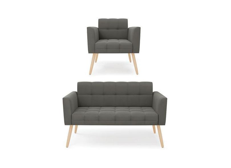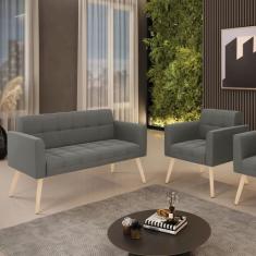 Kit 1 Sofá Namoradeira e 1 Poltrona Elisa Suede Grafite Pés Palito Nat