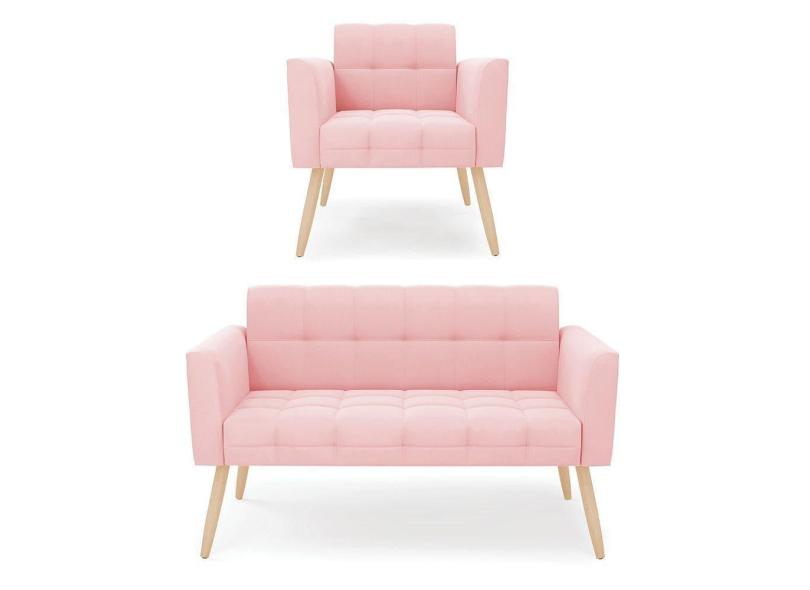 Kit 1 Sofá Namoradeira E 1 Poltrona Elisa Suede Pés Palito Natural - D`rossi Cor Rosa Bebê