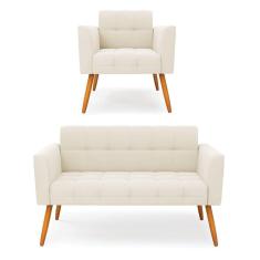 Kit 1 Sofá Namoradeira E 1 Poltrona Elisa Veludo Bege Pés Palito Castanho - D`rossi