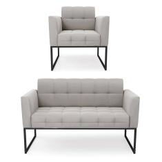 Kit 1 Sofá Namoradeira E 1 Poltrona Elisa Veludo Cinza Base Metálica Industrial Preto - D`rossi