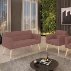Kit 1 Sofá Namoradeira E 1 Poltrona Elisa Veludo Rosê Pés Palito Natur