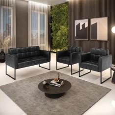 Kit 1 Sofá Namoradeira E 2 Poltronas Elisa Corano Preto Base Metálica