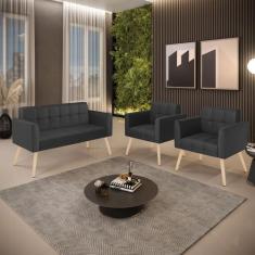 Kit 1 Sofá Namoradeira E 2 Poltronas Elisa Corino Preto Pés Palito Natural - D`rossi