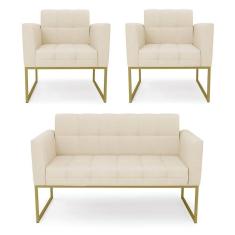 Kit 1 Sofá Namoradeira E 2 Poltronas Elisa Linho Base Metálica Industrial Dourada Cor A19 Bege