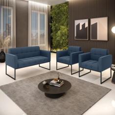 Kit 1 Sofá Namoradeira e 2 Poltronas Elisa Suede Azul Marinho Base Met