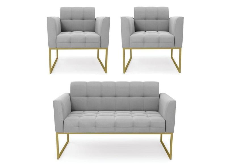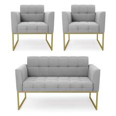 O menor preço encontrado no Brasil para Kit 1 Sofá Namoradeira E 2 Poltronas Elisa Suede Cinza Base Metálica Industrial Dourada D`rossi atualmente é R$ 2.131,11.