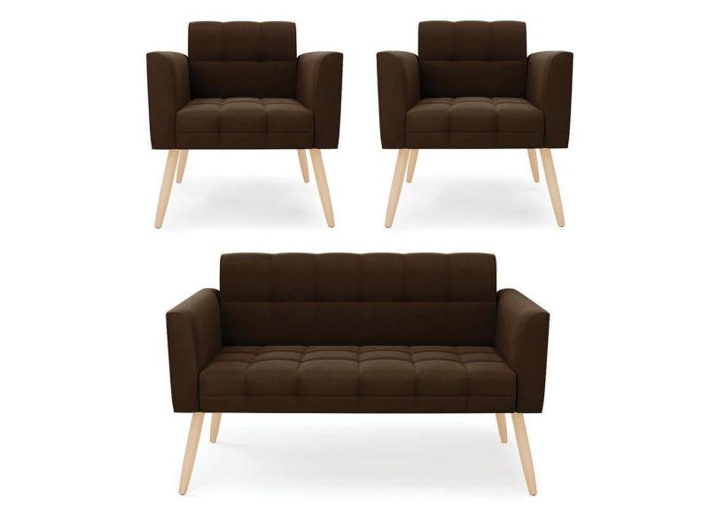 Kit 1 Sofá Namoradeira E 2 Poltronas Elisa Suede Marrom Pés Palito Natural - D`rossi