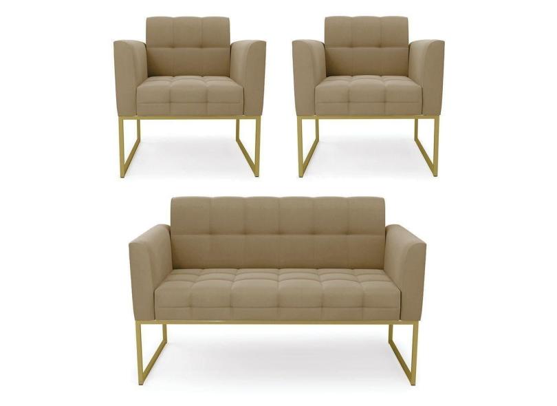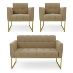 Kit 1 Sofá Namoradeira E 2 Poltronas Elisa Suede Marrom Rato Base Metálica Industrial Dourada