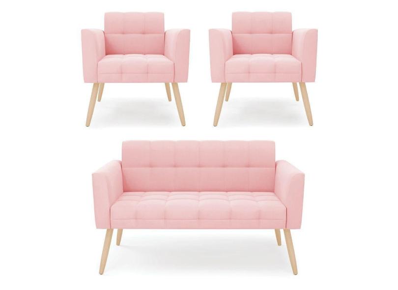 Kit 1 Sofá Namoradeira E 2 Poltronas Elisa Suede Rosa Bebê Pés Palito Natural - D`rossi