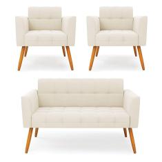 Kit 1 Sofá Namoradeira E 2 Poltronas Elisa Veludo Bege Pés Palito Castanho - D`rossi