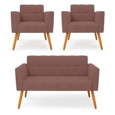 Kit 1 Sofá Namoradeira e 2 Poltronas Elisa Veludo Pés Palito Castanho - D`Rossi