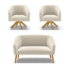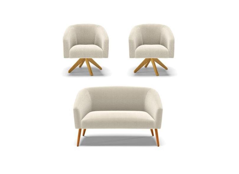 Kit 1 Sofá Namoradeira e 2 Poltronas Stella Bouclê Bege Base de Madeir