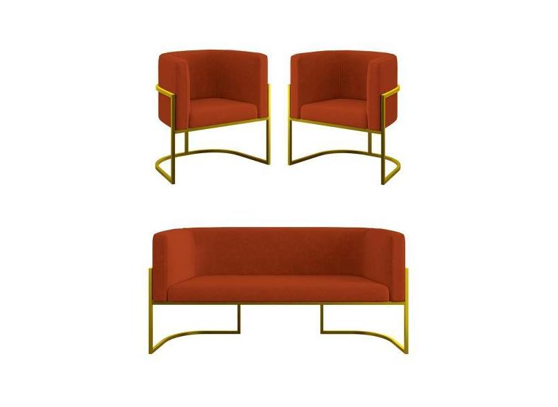 O menor preço encontrado no Brasil para Kit 2 Cadeiras Poltronas + Sofá 2 Lugares Base de Metal Dourado - B BA atualmente é R$ 2.184,72.