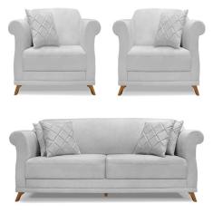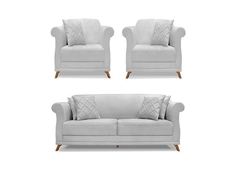 Kit 2 Poltronas e Sofá Living 2 Lugares 1,60m Vênus Linho Cinza Pés Ca