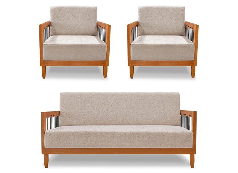 Kit 2 Poltronas e Sofá Living 2 Lugares Marilia 1,60m Linho Base em Madeira Castanho - Pallazio