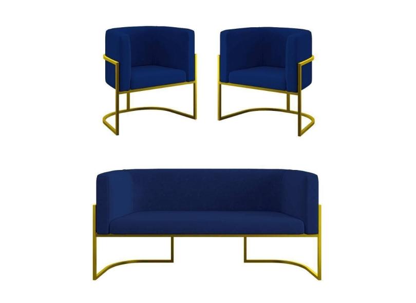 O menor preço encontrado no Brasil para Kit 2 Poltronas + Sofá 2 Lugares Base De Metal Gold Balaqui Azul Marinho atualmente é R$ 2.184,72.