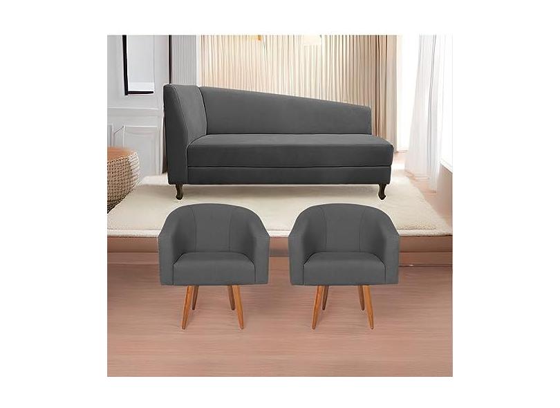 Kit Diva Recamier Heitor 140cm Lado Direito e 02 Poltronas Luiza Linho Cinza Escuro - Amarena Móveis