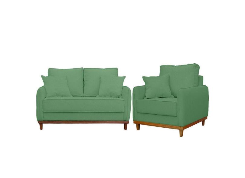 Kit Poltrona E Sofa Sena 2 Lugar Base De Madeira Para Sala Hotel Linho Verde