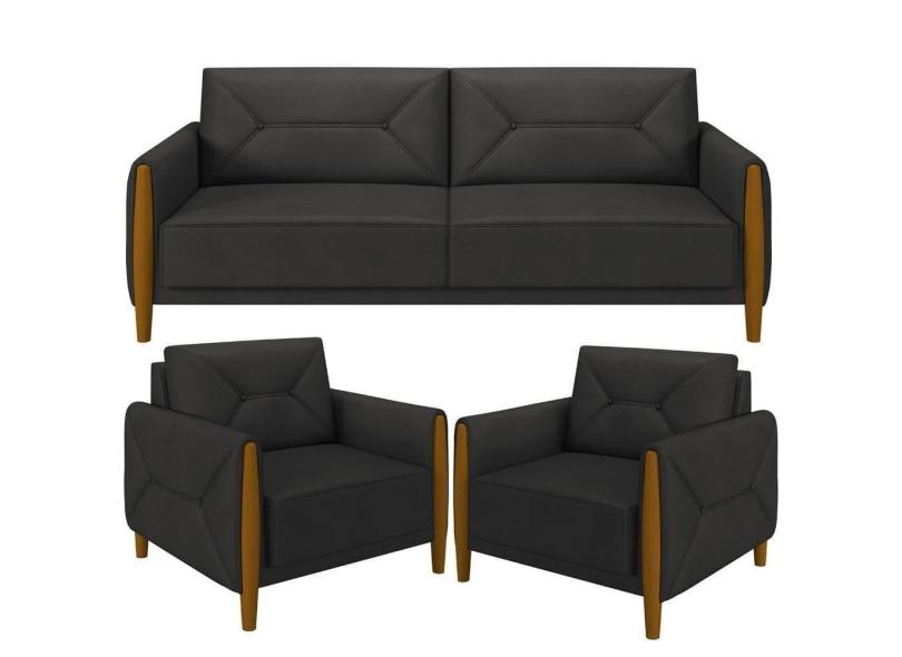 Kit Sofá 2 Lugares 165Cm Com 02 Poltronas Berilo M03 Preto