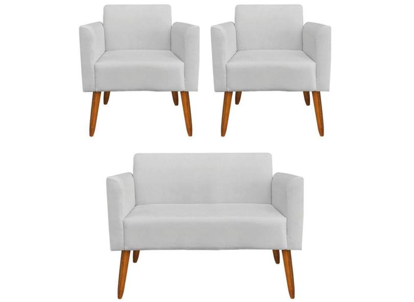 Namoradeira E 2 Poltronas Pés Palito Madeira Suede Cinza