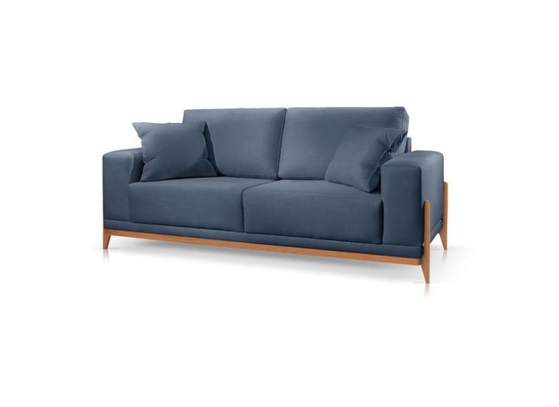 Sof 3 Lugares Almofada Solta Base Madeira Veludo Azul Bella