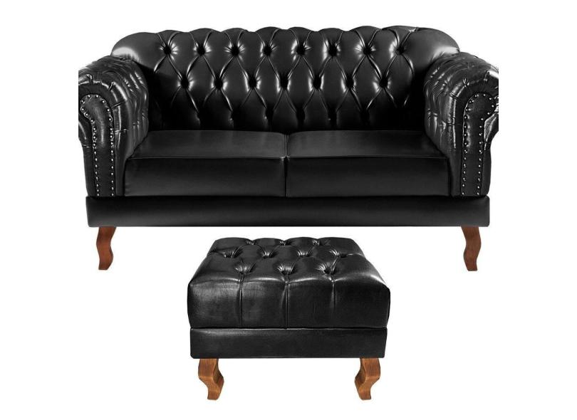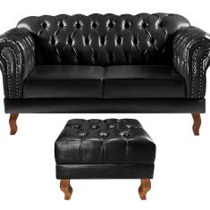 Sofá 2 Lugares com Puff Decoração Sara Recepção Dom Pedro Chesterfield Preto