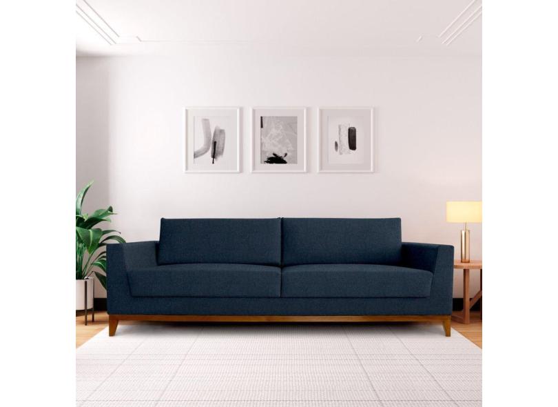 Sofá 3 Lugares 240cm Movie Estilo Moderno Linho Pés em Madeira Maciça Azul Jeans