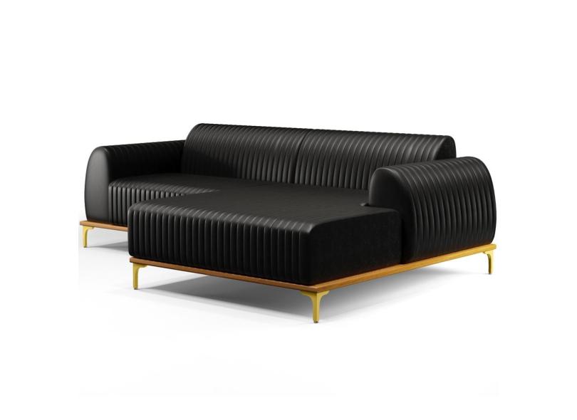 Sofá 3 Lugares com Chaise Direito Para Sala Molino 230cm D02 Couríssimo Preto B-159 - Lyam Decor