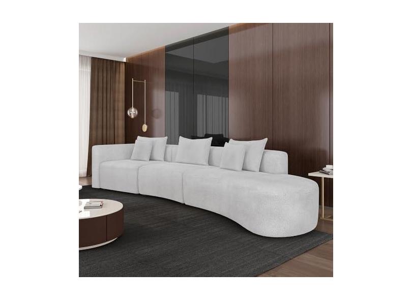O menor preço encontrado no Brasil para Sofá Curvo Decorativo Kimiko 447Cm 5 Lugares Sala de Estar com Chaise Bouclê Branco G52 - Gran Belo atualmente é R$ 45.583,12.