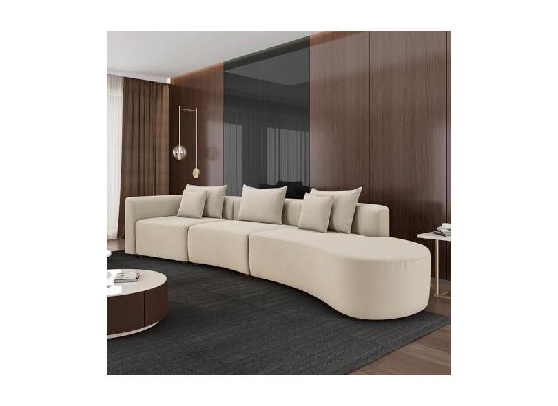 O menor preço encontrado no Brasil para Sofá Curvo Decorativo Kimiko 447Cm 5 Lugares Sala de Estar com Chaise Veludo Bege G52 - Gran Belo atualmente é R$ 5.139,90.