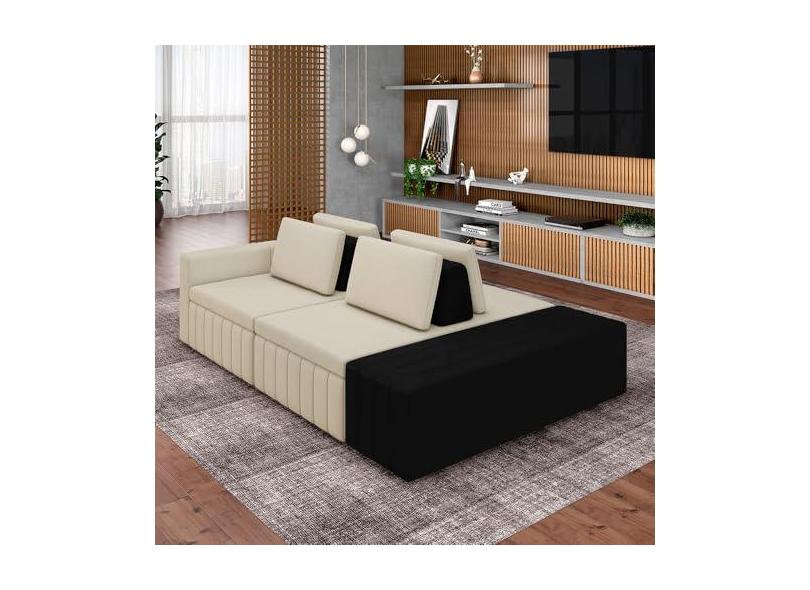 Sofá Ilha com Encosto e Almofadas Móveis Olimpo 245cm Modulado Linho/PU Bege/Preto G45 - Gran Belo