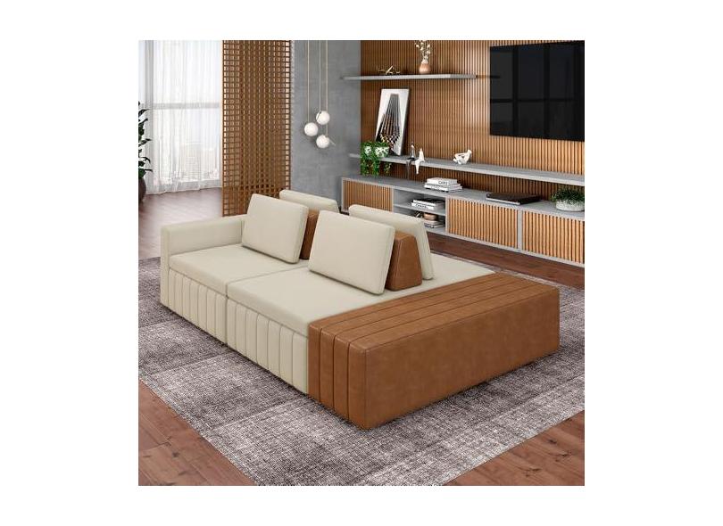 Sofá Ilha com Encosto e Almofadas Móveis Olimpo 285cm Modulado Linho/PU Bege/Caramelo G45 - Gran Belo