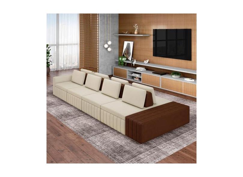 Sofá Ilha com Encosto e Almofadas Móveis Olimpo 505cm Modulado Linho/PU Bege/Marrom G45 - Gran Belo
