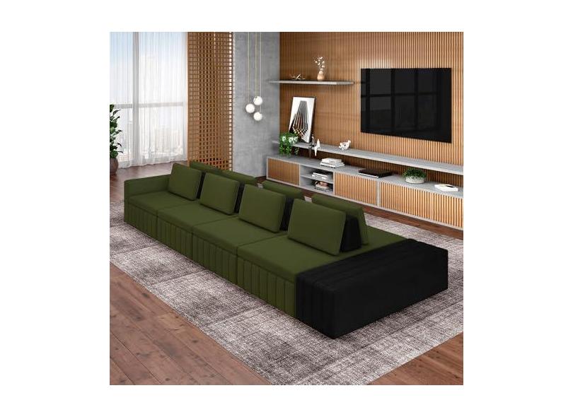 Sofá Ilha com Encosto e Almofadas Móveis Olimpo 505cm Modulado Linho/PU Verde/Preto G45 - Gran Belo