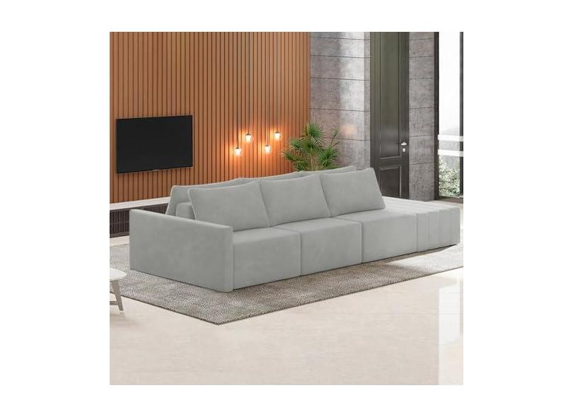 Sofá Ilha Modulado Milos 312cm Puff Lateral Veludo Cinza G33 - Gran Belo
