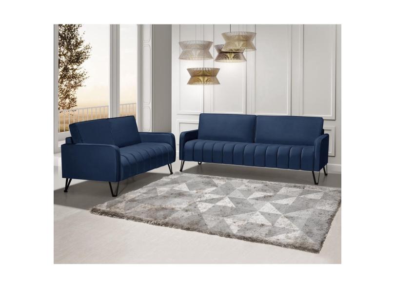 Sofá Living 3 e 2 Lugares Savana - 2,20/1,58mts Com Pé de Ferro Preto - Veludo Azul