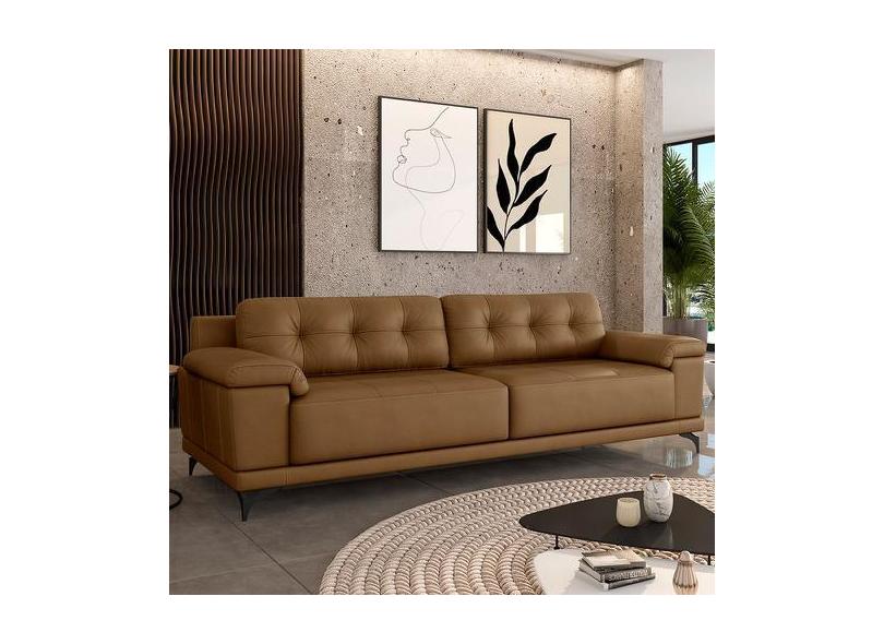 Sofá Living 3 Lugares 232cm Agostino Pés Design Em Ferro Couro Caramel