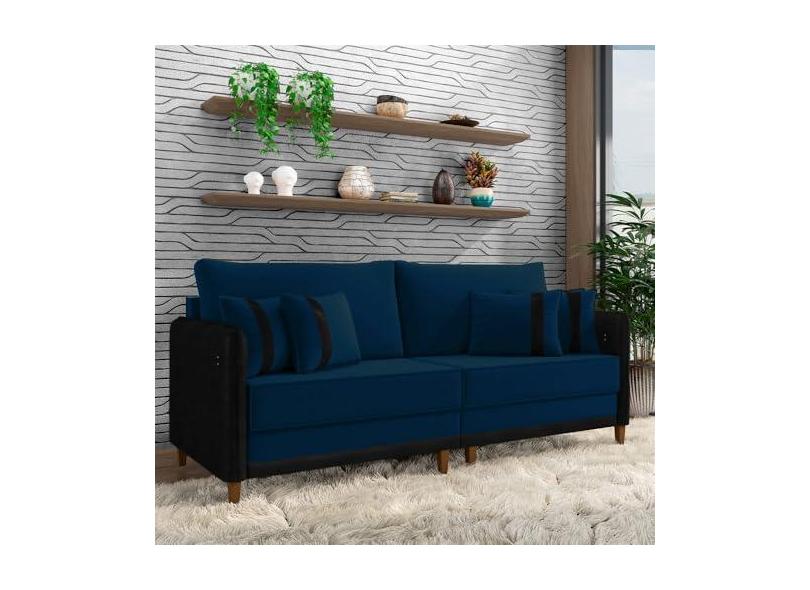 Sofá Living Montecarlo 3 Lugares Bipartido 232cm Pés em Madeira Veludo/PU Azul/Preto G33 - Gran Belo