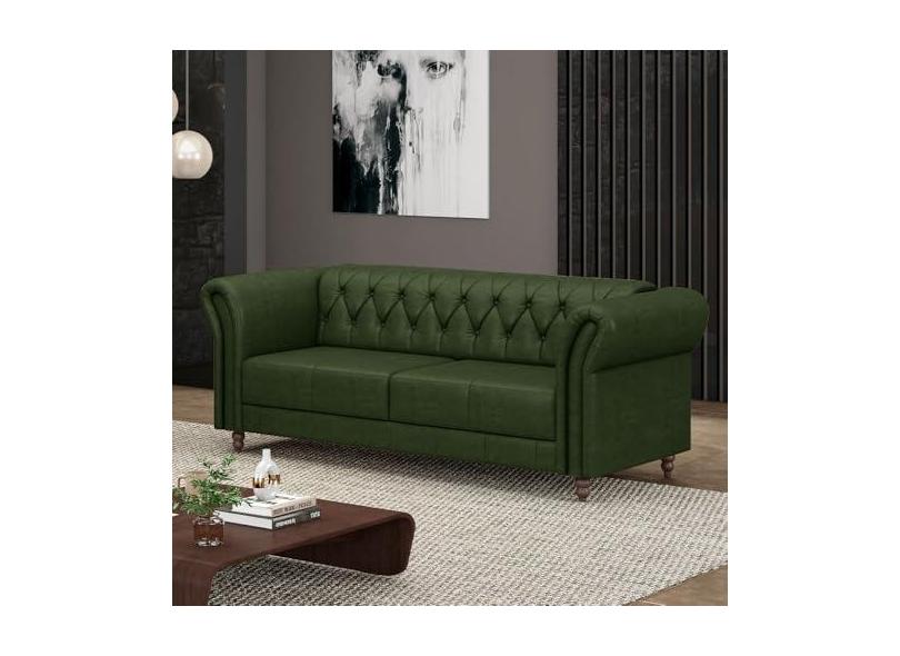 Sofá Living Sala de Estar Stanford Chesterfield 2 Lugares 200cm Pés de Madeira Couro Verde Manchado G58 - Gran Belo