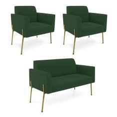 Sofá Namoradeira 2 Poltronas Pé de Ferro Dourado Marisa Veludo Verde D03 - D`Rossi