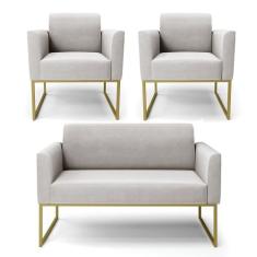 Sofá Namoradeira com 2 Poltronas Base Industrial Dourado Marisa Veludo