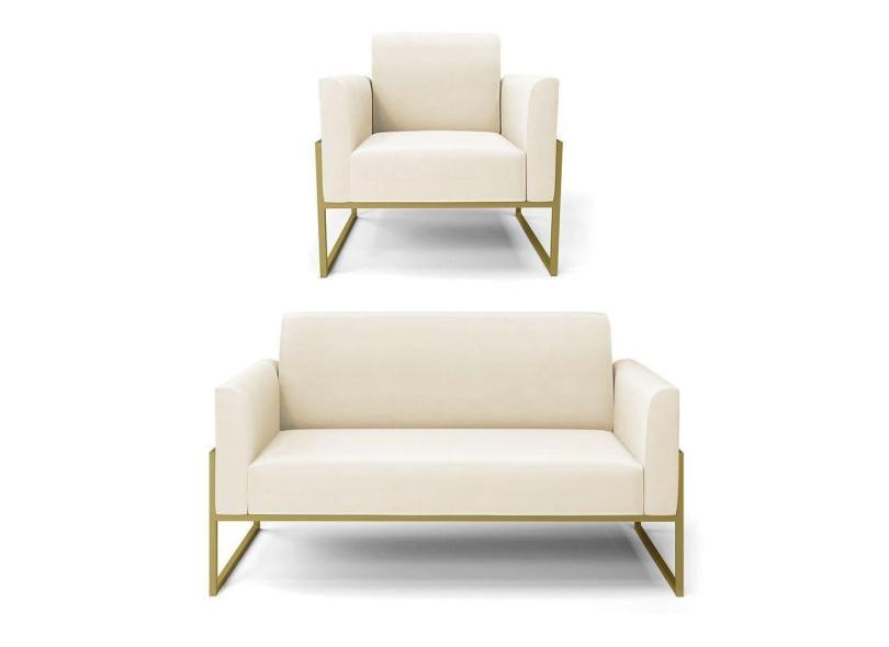 Sofá Namoradeira Com Poltrona Base Industrial Alta Dourado Marisa Veludo Bege D03 - D\`rossi