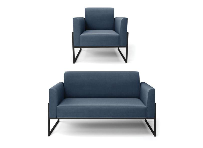 Sofá Namoradeira com Poltrona Base Industrial Alta Preto Marisa Suede Azul Marinho D03 - D`Rossi