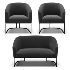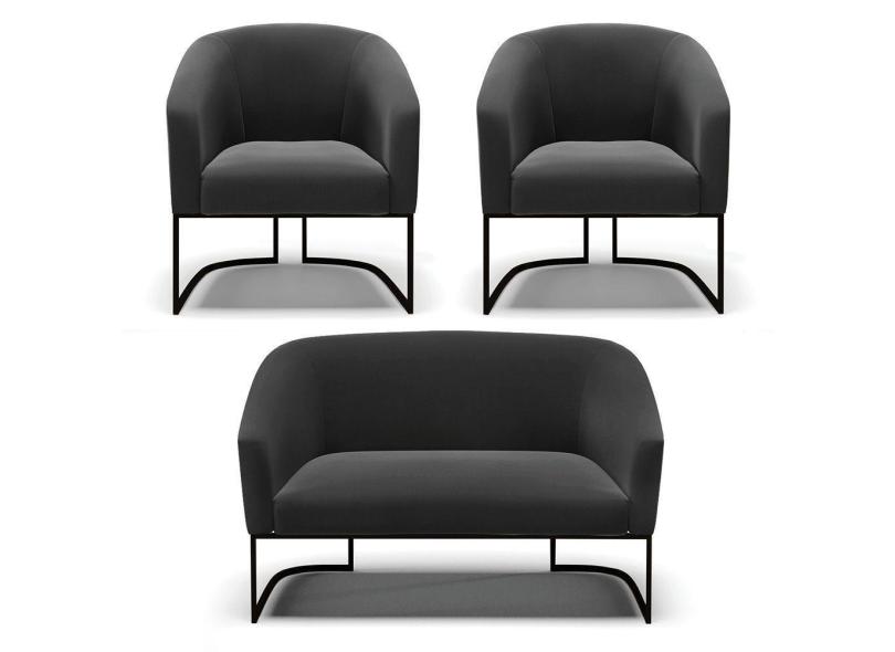 Sofá Namoradeira E 2 Poltronas Base Industrial Preto Stella Suede D03 - D'rossi Cor Preto