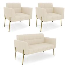Sofá Namoradeira E 2 Poltronas Pé De Ferro Dourado Elisa Linho D03 - D'rossi Cor A19 Bege