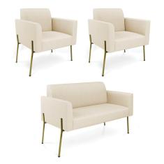 Sofá Namoradeira e 2 Poltronas Pé de Ferro Dourado Marisa Linho Bege D03 - D`Rossi