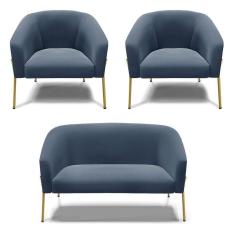 Sofá Namoradeira E 2 Poltronas Pé De Ferro Dourado Stella Suede Azul Marinho D03 - D`rossi