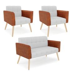 Sofá Namoradeira E 2 Poltronas Pés Palito Natural Elisa Nozes-linho Cinza A05 D03 - D'rossi