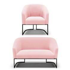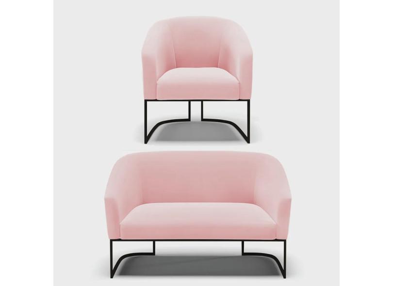 Sofá Namoradeira e Poltrona Base Industrial Preto Stella Suede Rosa Bebê D03 - D'Rossi